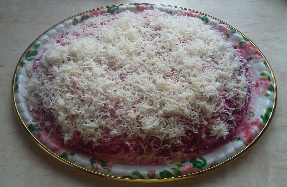 Теперь пора укладывать салат слоями. Сначала идет дайкон — его необходимо щедро пропитать заправкой. Затем добавляют картофель, морковь и яблоки, каждый слой тщательно промазывая заправкой. Завершает композицию свёкла, которая также должна пропитаться. Все слои не стоит слишком упрятывать, чтобы каждый из них успел впитать ароматную заправку.