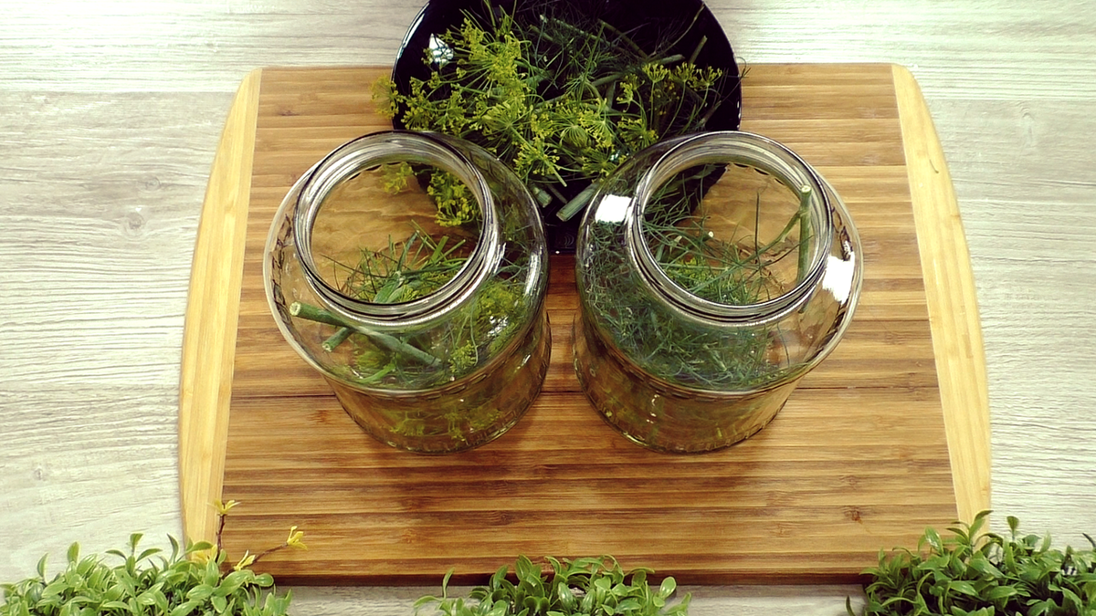 На дно каждой банки укладывается зелень по вкусу, добавляется очищенный и нарезанный чеснок, а также горчица в зёрнах. Следующий шаг — укладка огурцов. Их нужно разместить в банках как можно плотнее, чтобы максимально использовать пространство.