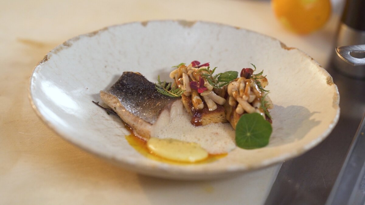 Процедите получившийся бульон, добавив к нему холодное сливочное масло в равных пропорциях и взбив смесь погружным блендером. Доведите соус до кипения и аккуратно поместите в него треску, готовя всего 4 минуты. Для подчеркивания аромата, используйте горелку для обжаривания рыбы.