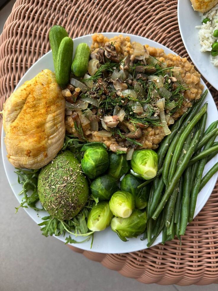 - Параллельное сочетание мяса с овощами и злаками для создания сбалансированного рациона.