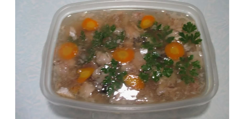 Перед заливкой бульона, украсьте готовый холодец кусочками моркови или зеленью для эстетического вида.