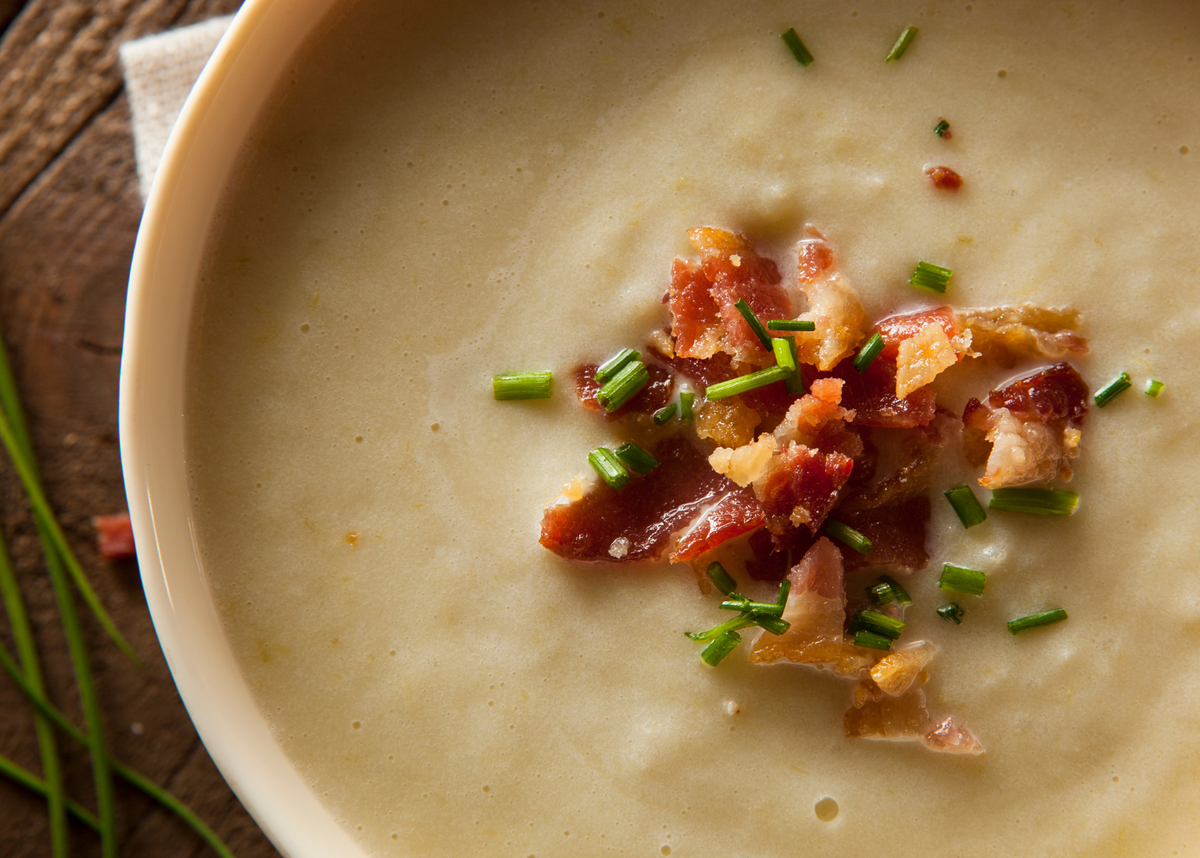 Разлить суп по тарелкам, украсить свежим зеленым луком и хрустящим беконом. Такой суп — прекрасный выбор для домашнего ужина!