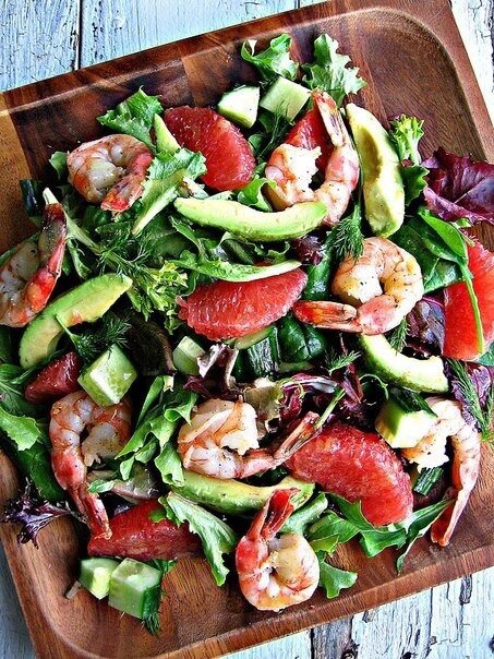 5. Собрать салат: На красивую широкую тарелку положите листья салата радиччо, затем добавьте нарезанные авокадо, огурец и креветки. Полейте заправкой и наслаждайтесь.