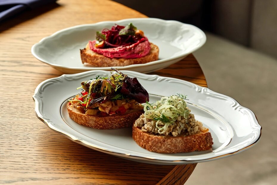 На ломтик подсушенного хлеба выкладываем смесь из нута, сверху добавляем натертую свеклу и украшаем зеленью и фундуком.Для второго бутерброда используем грибную икру: выкладываем ее на хлеб с углублением в центре и помещаем туда маринованный лук.На финале — бутерброд с баклажанной пастой, который также украшаем зеленью.Бутерброды готовы к подаче. Позвольте себе насладиться этими оригинальными и полезными закусками, которые можно разделить с друзьями через социальные сети!