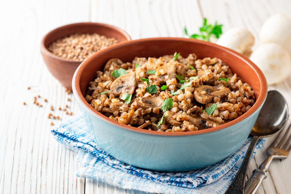 Промыть гречку и сварить. Обжарить лук и грибы, затем смешать с готовой кашей и подать с зеленью.