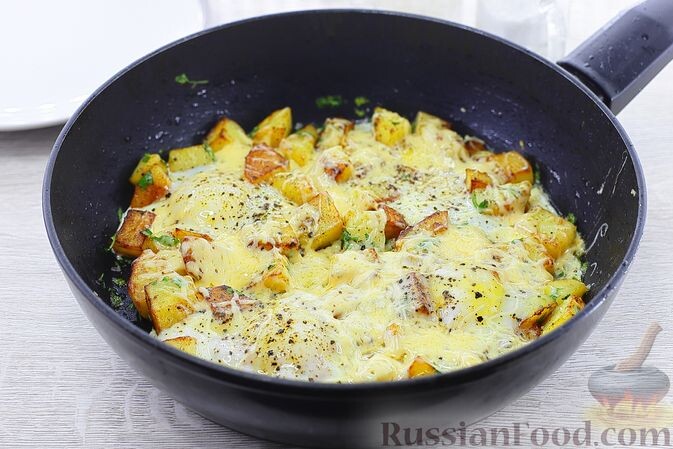 Яичница с жареной картошкой и сыром — это еще один отличный вариант, когда хочется чего-то сытного. Жареный картофель, приправленный чесноком и зеленью, создаст великолепное сочетание с яйцами и тёртым сыром, запечёнными до золотистой корочки.