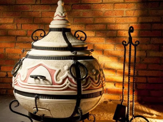 Эта печь, изготовленная вручную и обожженная при температуре свыше 1100 градусов, раскрывает все секреты восточной кухни. Её толстые стенки обеспечивают мгновенное нагревание и долгое сохранение тепла, что особенно полезно в холодное время года. В одной растопке можно запечь до трёх закладок мяса, а широкая горловина позволяет легко выпекать традиционные узбекские лепешки. Здесь можно готовить курицу, утку, гусей и даже целого барана без необходимости делить на порции.