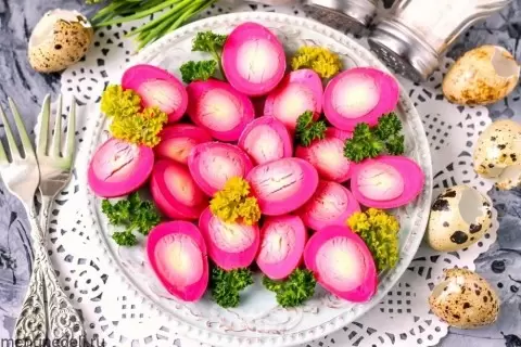 - Маринованные яйца со свёклой и уксусом — яркое и эффектное дополнение к пасхальному столу. Эти яйца не только красивы, но и обладают насыщенным вкусом.