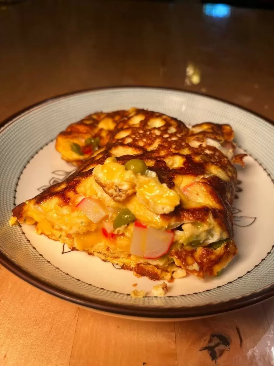 Процесс приготовления прост: яйца взбиваются с молоком, затем заливаются в разогретую сковороду. Добавляются горошек, крабовые палочки и сыр. После этого блюдо накрывают крышкой и готовят, пока края не схватятся. Затем рулет аккуратно заворачивается и нарезается на порции, что добавляет визуальной привлекательности и утоляет голод.