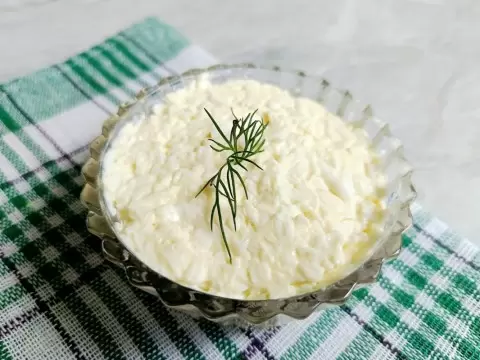 Затем все ингредиенты соединяются и заправляются майонезом, что придаст блюду необходимую сочность и вкус.
