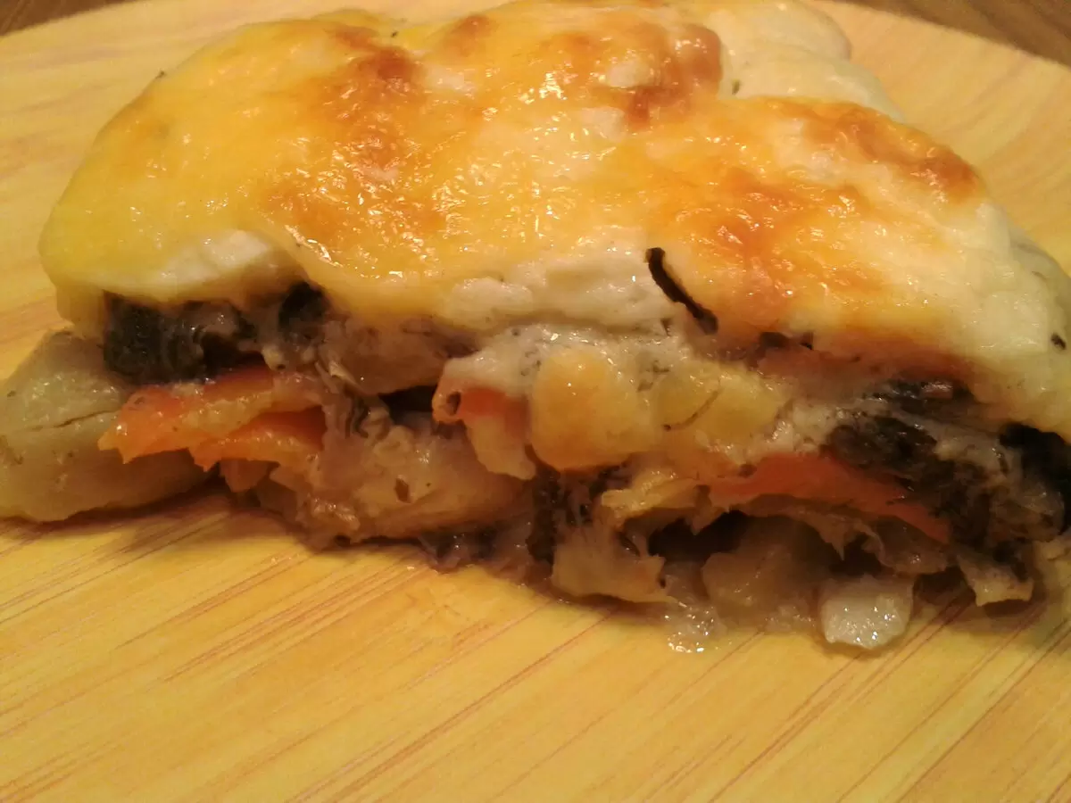 Блюдо собирается в форме для запекания. На дно выкладывается немного соуса, затем укладывается рыба и картофель вместе с грибами и луком. Вся конструкция заливается соусом и посыпается тертым сыром, после чего помещается в духовку для запекания до золотистой корочки.