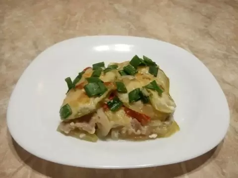 4. После того как все слои уложены, верхний слой тоже закрывают кабачками и обильно смазывают майонезом. Запеканка помещается в предварительно разогретую духовку до 180 градусов на один час. Затем, за пятнадцать минут до готовности, блюдо посыпается тертым сыром для получения аппетитной корочки.