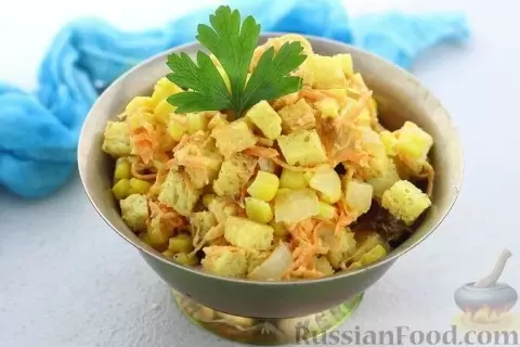 Также среди фаворитов — салат с колбасой, консервированными горошком и кукурузой. Он готовится за считанные минуты и станет отличным вариантом для быстрого перекуса.