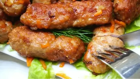 Чтобы процесс формирования колбасок стал легче, используется простая хитрость: верхнюю часть пластиковой бутылки отрезают, и в образовавшуюся трубку помещают фарш. С помощью руки фарш выдавливается через горлышко, формируя аккуратные колбаски. После этого подготавливают сковороду, разогревают растительное масло и обжаривают колбаски до золотистого цвета с обеих сторон, примерно по 1,5 минуты.