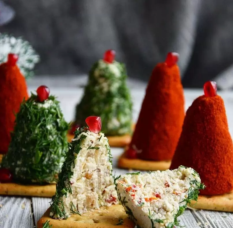 Расположите крекеры на сервировочном блюде и разместите на них сырные елочки. Для финального штриха украсьте верхушки гранатом, маслинами или цукатами — проявите свою фантазию!