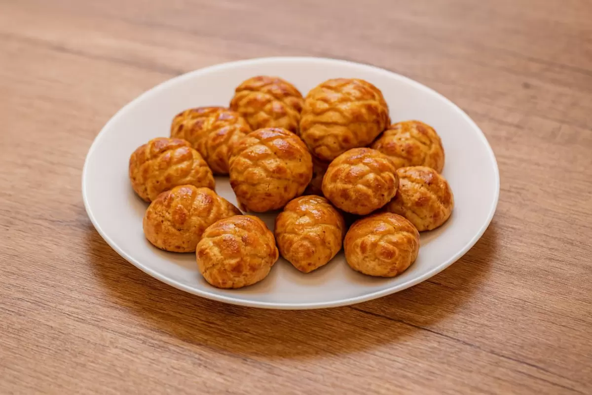 Отщипывая от теста небольшие кусочки, скатать их в шарики, затем придавать форму шишек, слегка приподнимая верхушки. На поверхности можно сделать вмятинки для декоративного эффекта. Выпекать в заранее разогретой духовке при 180 градусах около 15 минут до легкого золотистого оттенка, после чего дать остыть.
