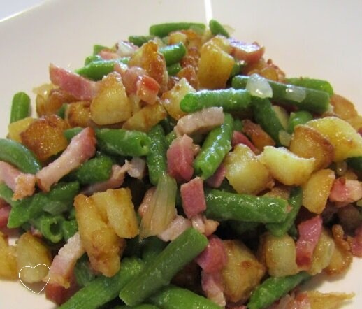 Собираем салат. На сковороду, где остался жир от ветчины, добавляют картошку, обжаривают её, а затем соединяют с фасолью и подсыпают соль и перец. Лук отделяют от маринада, который в дальнейшем пригодится для заправки.
