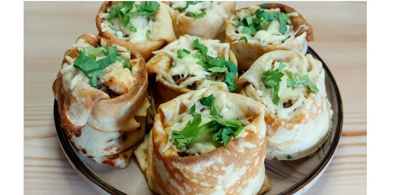 - Блины с начинкой удобно сворачивать рулетиками, конвертиками или мешочками.