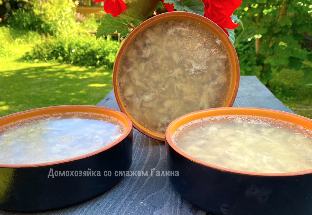 - После приготовления остудите, отделите мясо от костей и процедите бульон.
