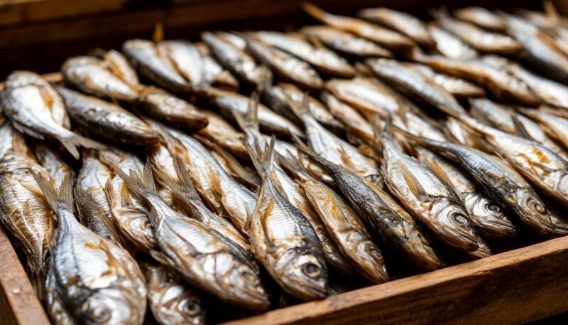 Для сушки подойдут как охлаждённая, так и замороженная рыба; заморозка надежно убивает паразитов. Некрупные виды — уклейка, плотва или окунь — лучше всего солить и сушить непотрошеными. Это позволяет жиру пропитать мясо, добавляя ? и улучшая консистенцию.
