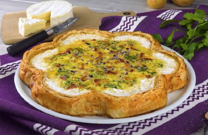После выпекания пирог оставляют на 15-20 минут, прежде чем нарезать. Это отличное блюдо как для обеда, так и для ужина. Вместо камамбера можно использовать и другие мягкие сыры, но именно камамбер придаст пирогу изысканный вкус.
