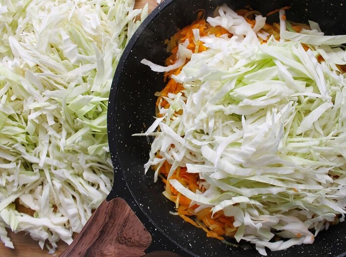 Начните с обжаривания мелко нарезанного лука с тертой морковью на растительном масле до золотистого цвета. Затем добавьте тонко нарезанную капусту; именно такая нарезка придаёт блюду особую лёгкость и насыщенность.