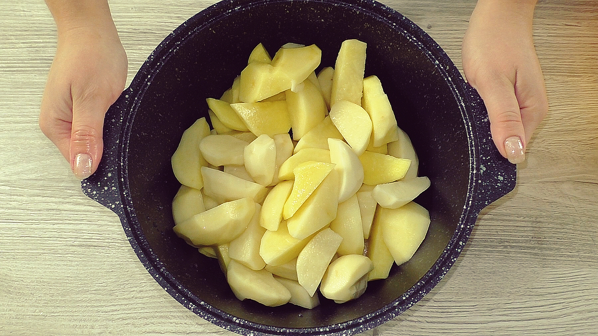 Картофель и лук предварительно хорошо моются и очищаются. Картофель следует нарезать крупными кусочками, в то время как лук можно мелко нарезать кубиками или полукольцами — на ваш вкус.