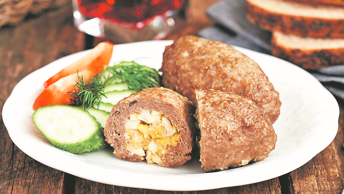 Корки с хлеба срезать и мякиш замочить в сливках.Свинину прокрутить вместе с хлебом, луком и чесноком через мясорубку.Добавить соль и перец, тщательно вымешать и отбить массу. Убрать в холодильник на полчаса.Два яйца отварить вкрутую, рубить и смешать с петрушкой и маслом.Сформировать из фарша круглые лепешки, положить начинку и защипнуть края.Окунать в взбитые яйца и панировать в сухарях.Жарить до золотистой корочки, затем запекать в духовке 20 минут при 180 °C.Шоколадный пудинг на завтрак