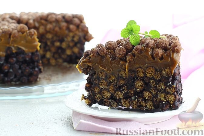 Торт из сухих завтраков с медово-сливочной глазурью покоряет шоколадом и текстурой. Хрустящие кружки соединяются с шоколадной смесью и вареной сгущенкой, а затем отправляются в холодильник для пропитки. Это настоящая находка для сладкоежек.