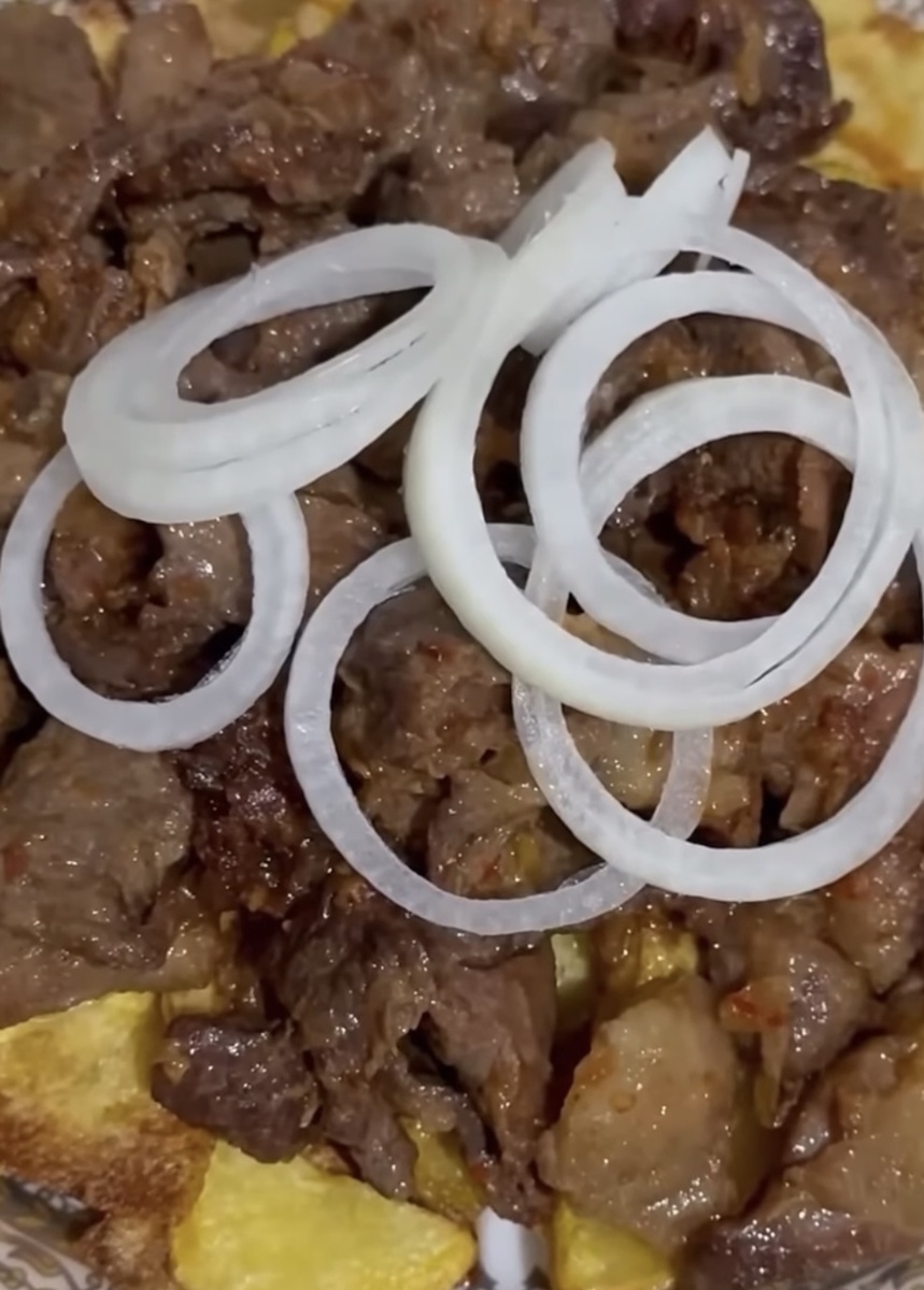 Как только картофель готов, на него выкладывается обжаренное мясо. Это блюдо отлично сочетается со свежим овощным салатом, который добавляет яркость и легкость к ужину.