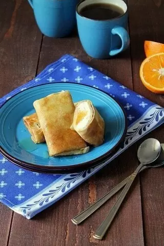 Приготовление блинов: Разогреть сковороду, при необходимости смазав её растительным маслом. Выпекать блинчики до золотистой корочки. На каждый блин положить 1-2 столовые ложки творога и несколько дольек апельсина. Завернуть в виде конвертика.