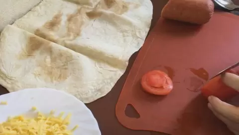 Далее, на противне раскладывается лаваш. Проведите по его поверхности кетчупом и майонезом, чтобы создать ароматную базу для начинки. После этого приступаем к выкладыванию ингредиентов: сначала колбаса и помидоры, а сыр добавляем в самом конце — он станет финальным штрихом в этом гастрономическом шедевре.