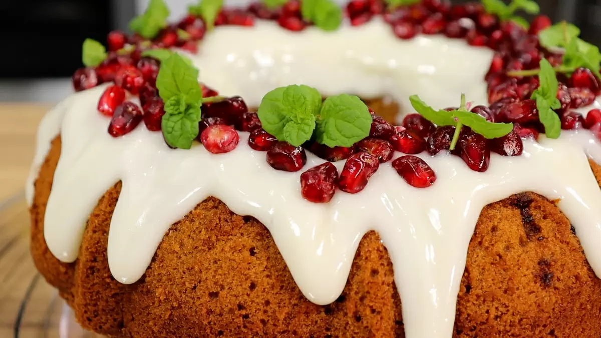После выпекания кекс нужно остудить в форме, а затем перевернуть на тарелку. Для глазури смешайте сливочный сыр с сахарной пудрой, добавляя лимонный сок по вкусу для баланса сладости. Получившуюся глазурь аккуратно полейте кексом и украсьте зернами граната и свежей мятой.