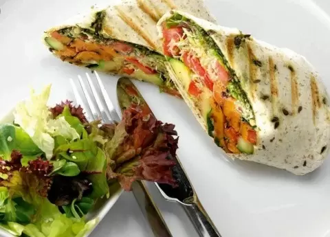 Сначала обжарьте на гриле сладкий перец, нарезанный на кольца, цукини (толщиной около 1,5 см) и батат, предварительно нарезанный дольками не толще 1 см. Обжаривайте овощи до готовности с обеих сторон, затем нарежьте их крупной соломкой.Нарежьте огурцы и помидоры кубиками среднего размера, а красный лук — мелко. Это добавит свежести и яркости в блюдо.Разогрейте тортильи на сковороде, чтобы они стали мягкими и эластичными. Затем намажьте их песто и выложите часть салатных листьев, помидоры, огурцы, лук и жареные овощи. Добавьте майонез и ростки люцерны по вкусу.После этого сложите края тортильи и аккуратно скрутите буррито. Обжарьте его с обеих сторон на гриле до золотистой корочки.Подавайте буррито с дополнительными салатными листьями, посыпанными кунжутом, и добавьте несколько капель оливкового масла extra virgin для завершения блюда.