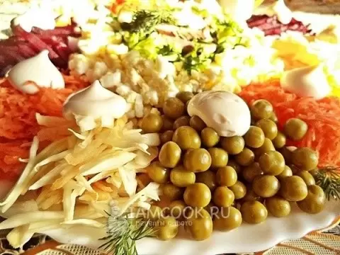Остуженные яйца режут мелко, они помогут создать гармонию между острыми и кисловатыми компонентами. Затем стоит открыть банку зеленого горошка и слить жидкость. На большом плоском блюде размещают нарезанное мясо в центре, а вокруг удобными лепестками располагают капусту с яблоком, нарезанную свеклу, натертую морковь, яйца и зеленый лук. Завершающим штрихом станет украшение веточками укропа.