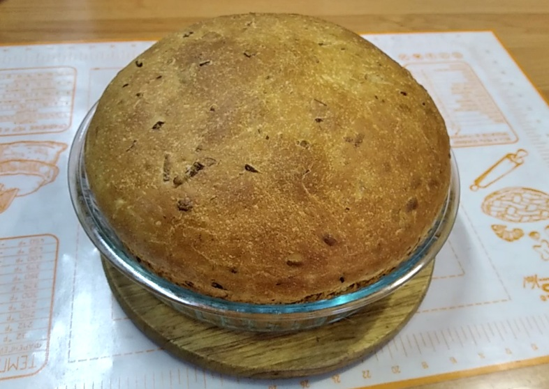 • Смажьте верх хлеба растительным маслом и выпекайте в предварительно разогретой до 200 °C духовке в течение 50-60 минут. После выпекания дайте хлебу немного остыть, прежде чем разрезать.