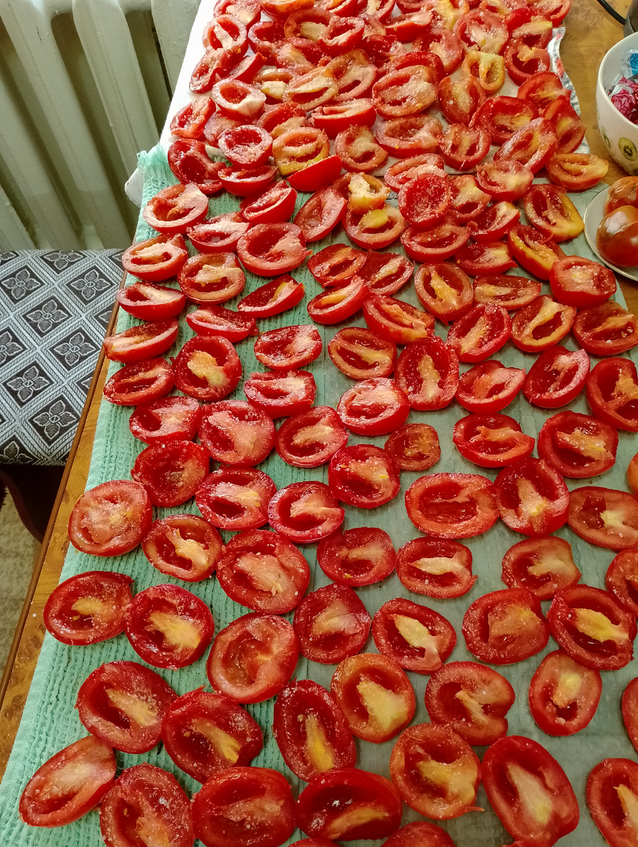 После того как томаты отдали сок, следует слить его и завернуть помидоры в сухую текстильную салфетку, чтобы удалить лишнюю влагу. На следующем этапе помидоры раскладываются на специальные сушилки. Время сушки варьируется от 10 до 15 часов.